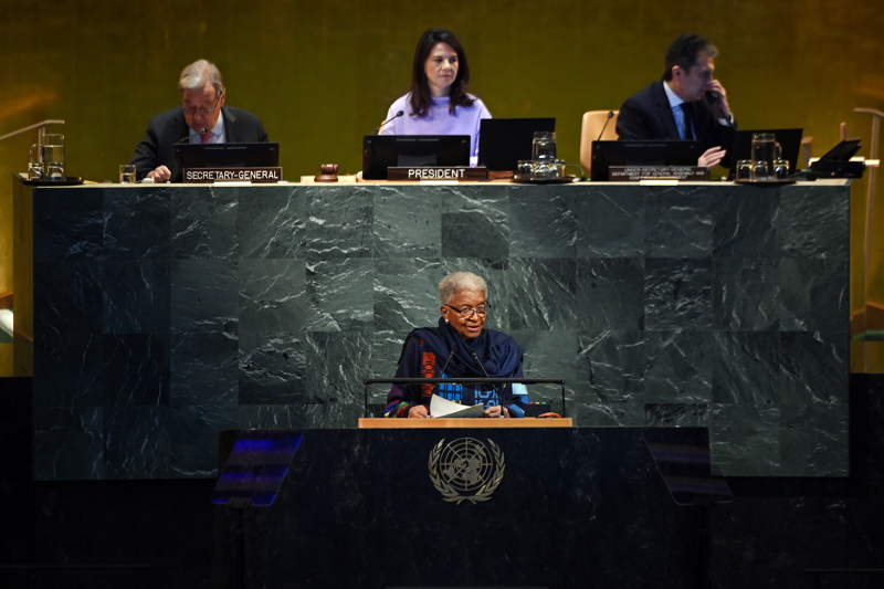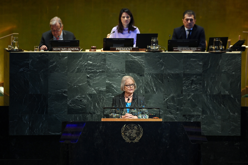挪威前首相、世界卫生组织前总干事格罗·哈莱姆·布伦特兰(前)在纪念联合国成立80周年高级别会议上讲话