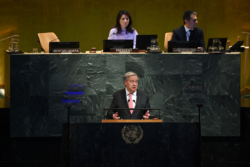 联合国秘书长安东尼奥·古特雷斯(前)在纪念联合国成立80周年高级别会议上讲话