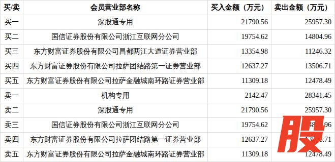 具体来看,今日上榜的营业部中,共有1家机构专用席位现身,即卖一,买入金额2142.47万元,卖出金额2.83亿元,合计净卖出2.62亿元,深股通为第一大买入营业部及第二大卖出营业部,买入金额为2.18亿元,卖出金额为2.60亿元,合计净卖出4166.73万元。